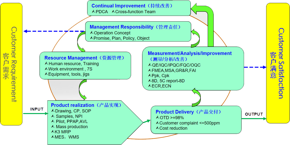 我司严格按照ISO9001/IATF 16949标准的相关要求建立质量管理体系,并持续改进,满足顾客要求